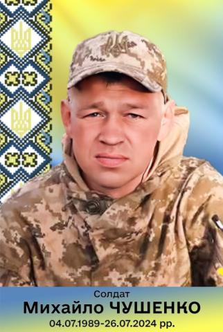 Чушенко Михайло Володимирович 12.11.2025, 15:49 2 Дата народження: 04 липня 1989Дата загибелі: 26 липня 2024Чушенко Михайло Володимирович - учасник російсько-української війни.