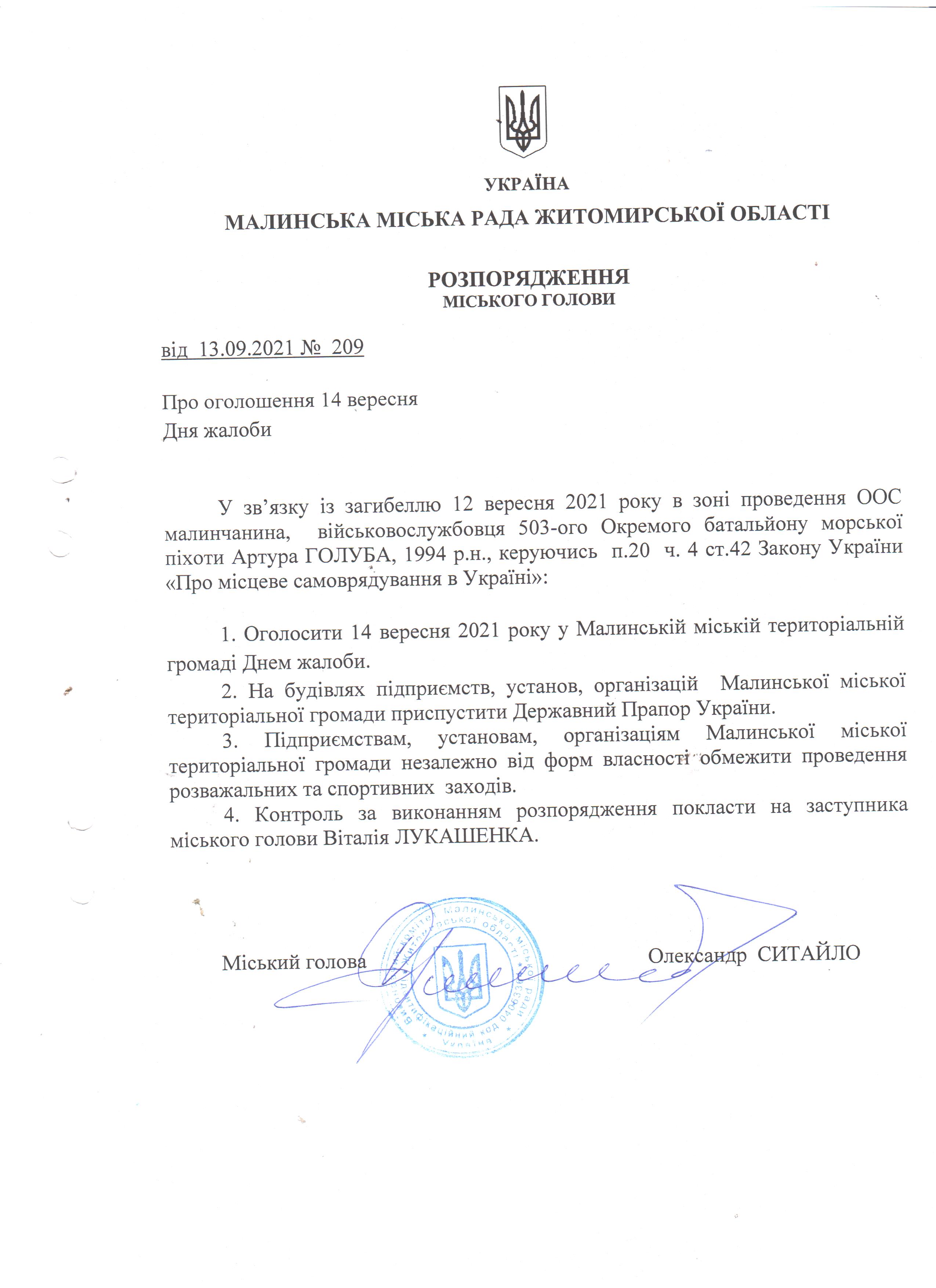 Розпорядження міського голови | № 201 Про затвердження Інструкції про порядок ведення обліку, зберігання, використання і знищення документів та інших матеріальних носіїв інформації, що містять службову інформацію у виконавчому комітеті Малинської міської ради