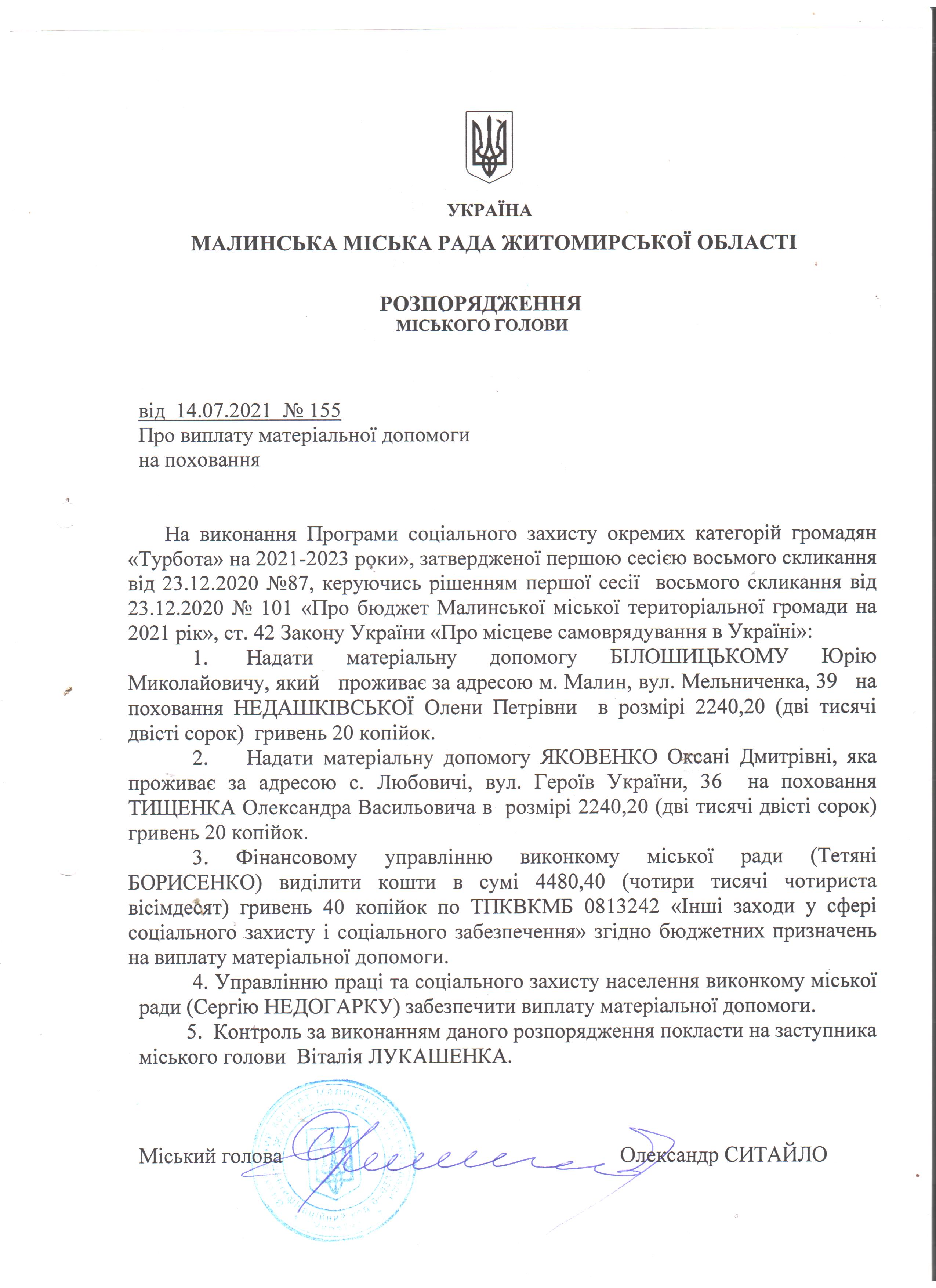 Розпорядження міського голови | №155 Про виплату матеріальної допомоги на поховання