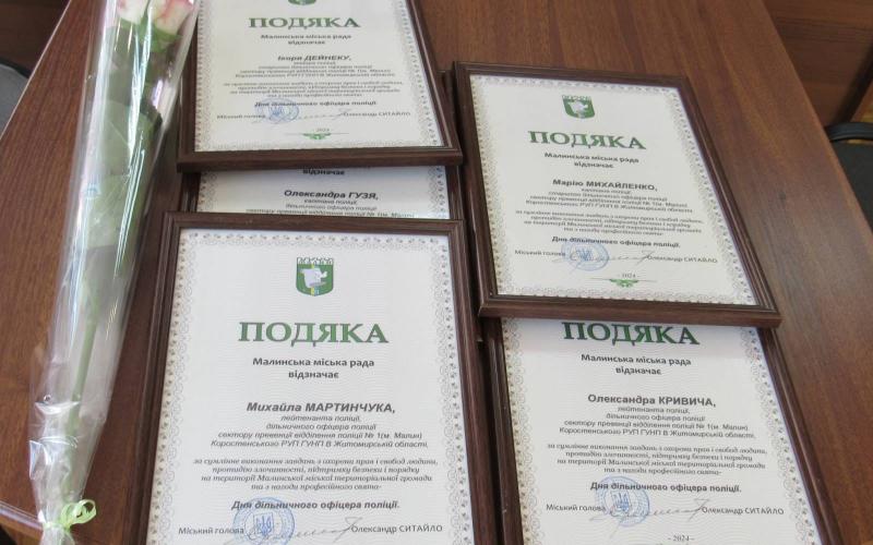 Від імені міського голови Олександра Ситайла наших дільничних офіцерів привітав його заступник Павло Іваненко. Він подякував поліцейським за роботу та побажав більше спокійних робочих днів, людської вдячнoсті, миру та добробуту, а також вручив Подяки Малинської міської ради.