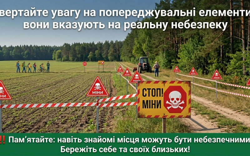 Звертайте увагу на попереджувальні елементи (попереджувальні знаки «Обережно міни», сигнальні стрічки) — вони вказують на реальну небезпеку.