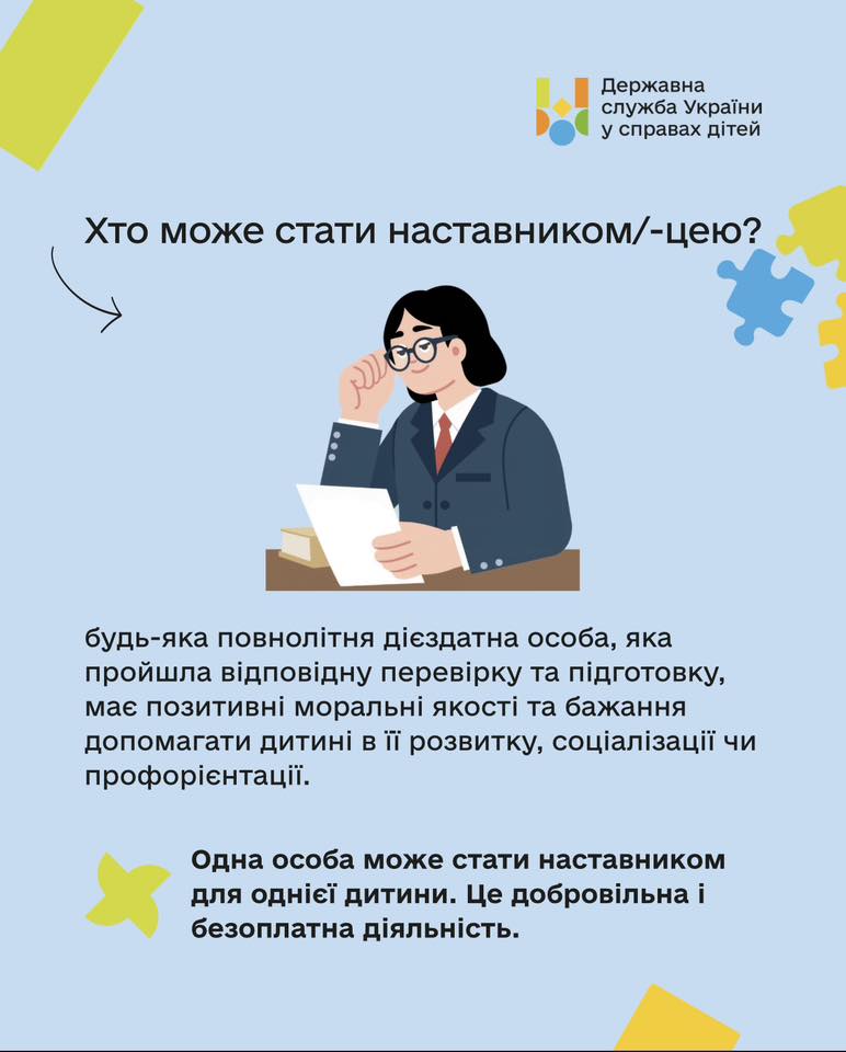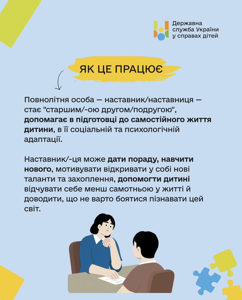 Наставництво — це про підтримку, довіру та справжню дружбу з дитиною, яка потребує уваги дорослого. Це можливість допомогти повірити у власні сили, розкрити здібності та підготуватися до самостійного життя.