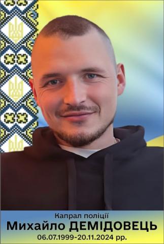 Демідовець Михайло Михайлович - учасник російсько-української війни. Капрал поліції особливого призначення підрозділу "КОРД".