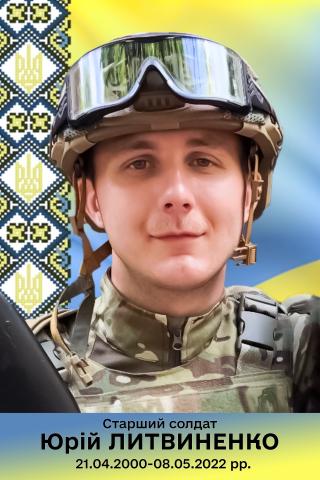 Литвиненко Юрій Сергійович - учасник російсько-української війни. Старший солдат, старший кулеметник 1- го відділення розвідки взводу розвідки спеціального призначення 1- го батальйону оперативного призначення окремого загону спеціального призначення" Азов" військової частини 3057 східно оперативно- територіального об'єднання Національної Гвардії України.