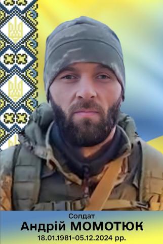 Момотюк Андрій Анатолійович 31.12.2024, 10:32 222 Дата народження: 18 січня 1981Дата загибелі: 05 грудня 2024Момотюк Андрій Анатолійович - учасник російсько-української війни. Солдат.
