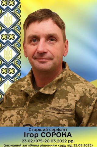 Сорока Ігор Григорович 12.11.2025, 15:42 9 Дата народження: 23 лютого 1975Дата загибелі: 20 березня 2022Сорока Ігор Григорович - учасник російсько-української війни.