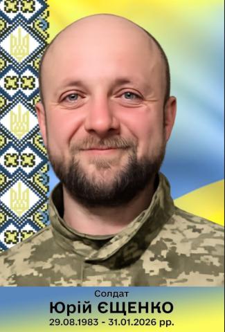Єщенко Юрій Вікторович 26.02.2026, 12:32 7 Дата народження: 29 серпня 1983Дата загибелі: 31 січня 2026Єщенко Юрій Вікторович – учасник російсько-української війни, солдат.