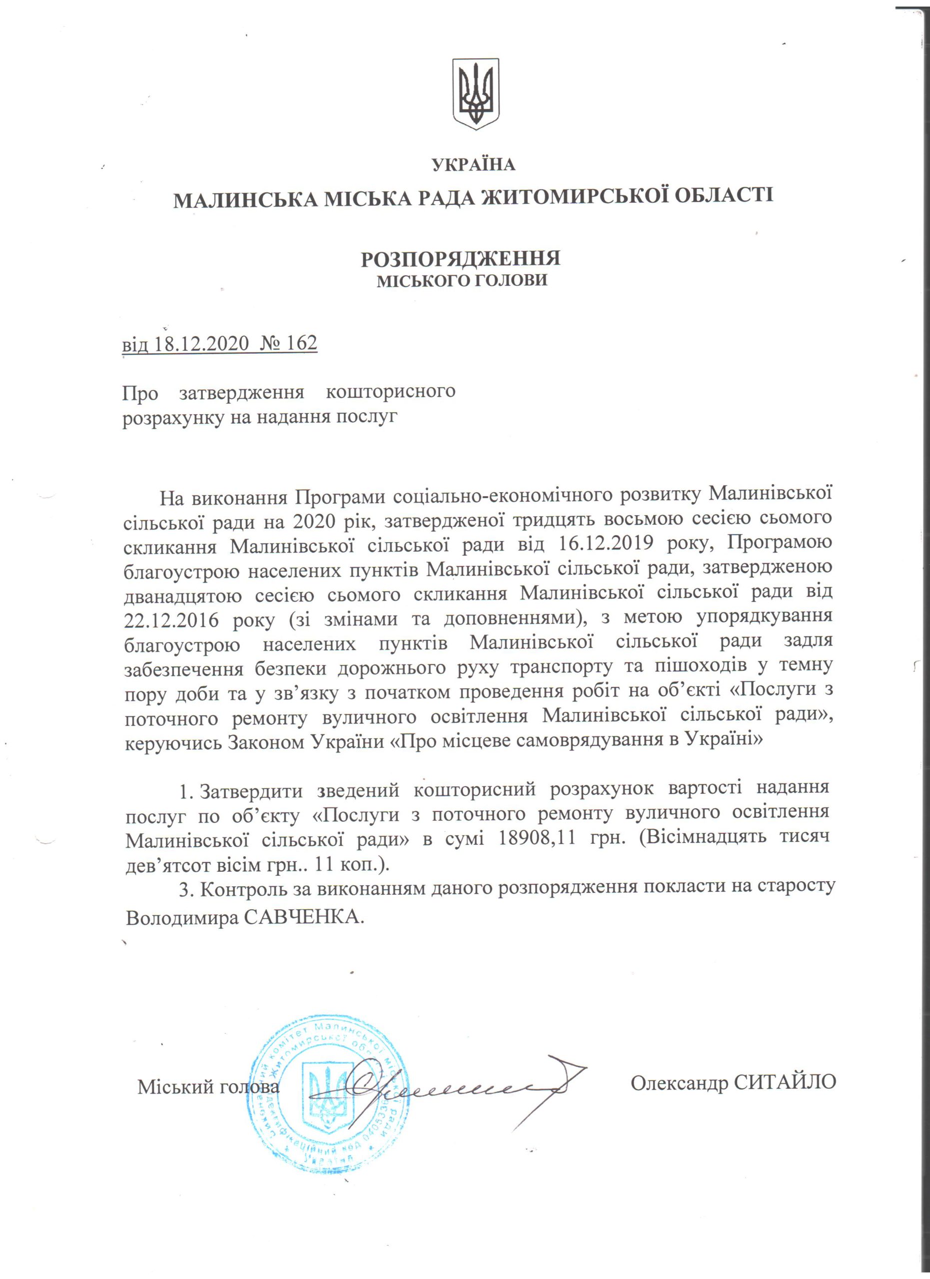 № 162 Про затвердження кошторисного розрахунку на надання послуг