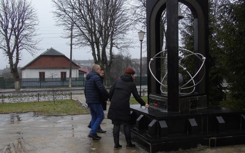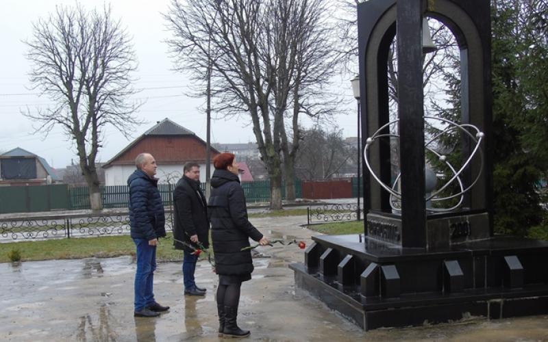 На фото: заступник міського голови Віталій ЛУКАШЕНКО, керуюча справами виконавчого комітету Ірина КОПИЛО та голова Малинської РДА Сергій КИРИЧЕНКО покладають квіти до пам’ятного знаку жертвам Чорнобиля.