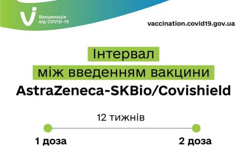 Тому Оперативний штаб Міністерства охорони здоров’я України з вакцинокерованих інфекцій схвалив рекомендації Національної технічної групи експертів з питань імунопрофілактики збільшити інтервал між введенням першої та другої доз вакцини Covishield/AstraZeneca до 12 тижнів.