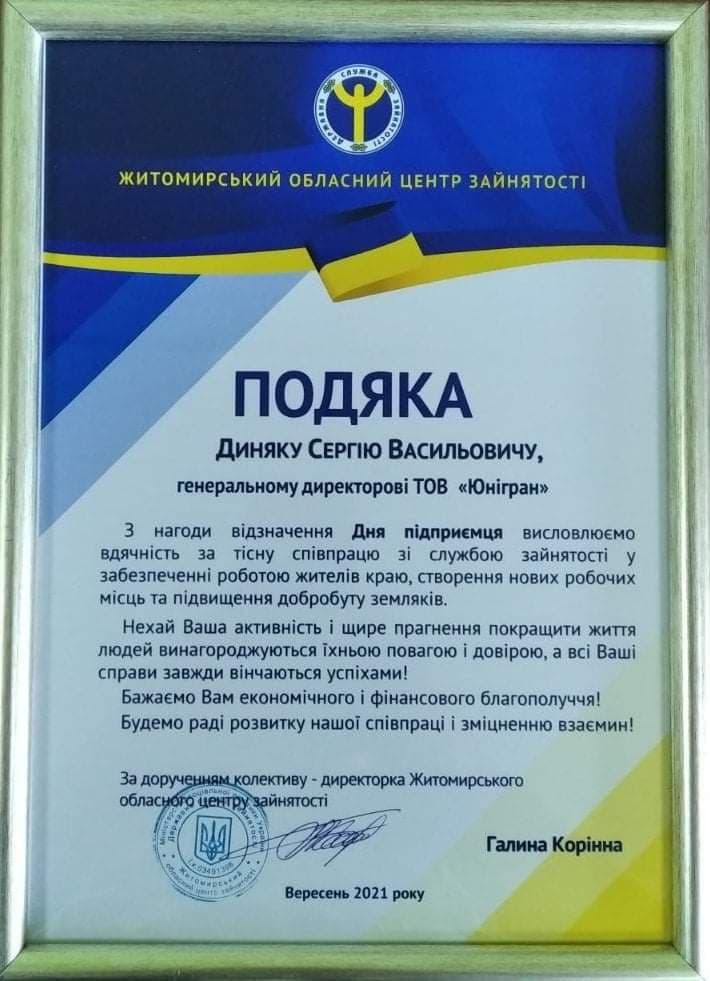 Користуючись нагодою, за дорученням директорки Житомирського обласного центру зайнятості Galina Korinna, Михайло Борисович висловив вдячність керівникам ТОВ «Юнігран» Сергію Диняку та П(ПО)СП «Малинівське» Руслану Райничу за тісну співпрацю зі службою зайнятості у забезпеченні роботою жителів громади та підвищенні добробуту земляків, привітав колективи з прийдешнім святом #Дeнь_підприємця і вручив Подяки, бажаючи підприємцям, подальшого розвитку і фінансової стабільності!