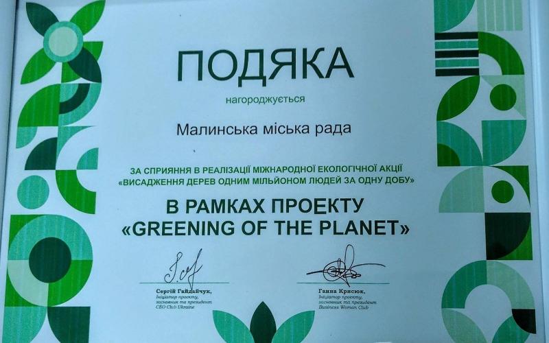 Малинську міську раду відзначено подякою за сприяння в реалізації міжнародної екологічної акції «Висадження дерев одним мільйоном людей за одну добу» в рамках проєкту«Greening of the Planet».