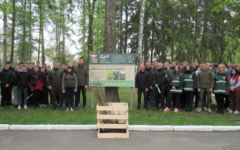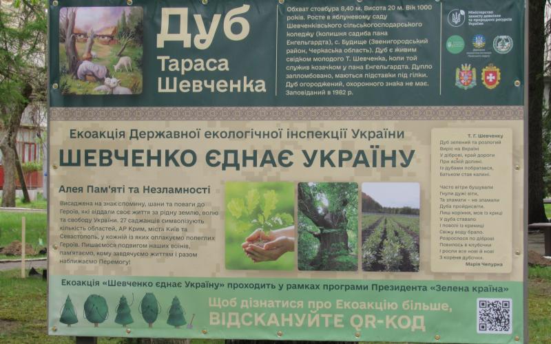 За сприяння Державної екологічної інспекції та ДП «Ліси України» на території Малинського фахового коледжу було висаджено 27 сіянців, які вирощені у лісовому розсаднику Черкащини з жолудів, зібраних з Дуба Шевченка. Це дерево вже понад 1000 років росте у селиці Будище, і саме у ньому, за переказами, малий Тарас ховав свої малюнки від пана Енгельгардта.