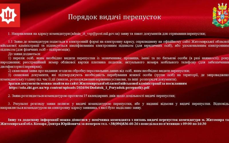 З метою забезпечення громадського порядку, безпеки населення та належного контролю за пересуванням осіб у період дії комендантської години на території Житомирської області запроваджено оновлений порядок оформлення перепусток. Відповідне рішення введено в дію розпорядженням голови ради оборони області №14 від 27 березня 2026 року за результатами засідання ради оборони.