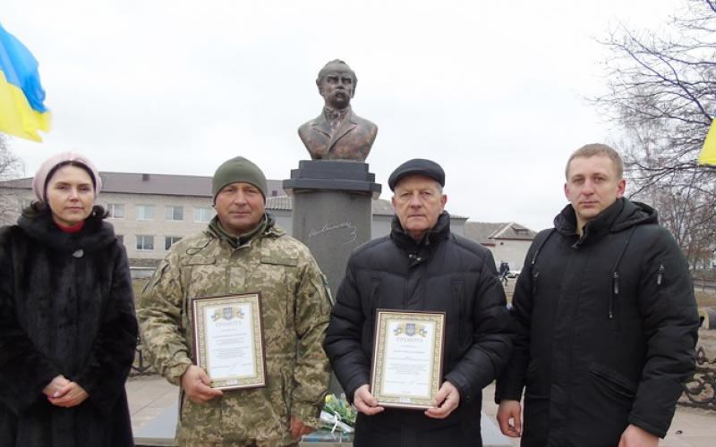 Зі святом усіх привітали перший заступник міського голови Петро Піковський та помічник народного депутат України Андрія Пузійчука Олеся Грабовська. Вона вручила з нагоди Дня Соборності Грамоти від народного депутата України та цінні подарунки малинчанинам – Ігорю Загоровському, командиру 142-го окремого батальйону територіальної оборони, та Леоніду Шевчуку — директору міської школи №2.