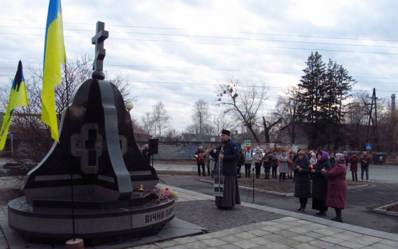 Отець Василь, настоятель Свято-Покровської церкви, відслужив панахиду за нашими загиблими земляками. Проникливо звучала пісня «Свіча» у виконанні Ірини Максименко. До Пам’ятного знаку лягли живі квіти, а присутні запалили свічки пам’яті та приєдналися до загальнонаціональної хвилини мовчання.
