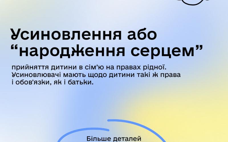 Усиновлення або “народження серцем” — прийняття дитини в сім’ю на правах рідної. Усиновлювачі мають такі ж права й обовʼязки щодо дитини, як і батьки.