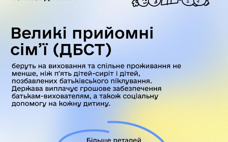Великі прийомні сім’ї (ДБСТ): беруть на виховання та спільне проживання не менше, ніж пʼять дітей-сиріт і дітей, позбавлених батьківського піклування. А держава виплачує грошове забезпечення батькам-вихователям, а також соціальну допомогу на кожну дитину.