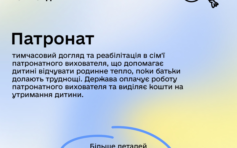 Патронат: тимчасовий догляд та реабілітація в сім'ї патронатного вихователя, що допомагає дитині відчувати родинне тепло, поки батьки долають труднощі. Держава оплачує роботу патронатного вихователя та виділяє кошти на утримання дитини.