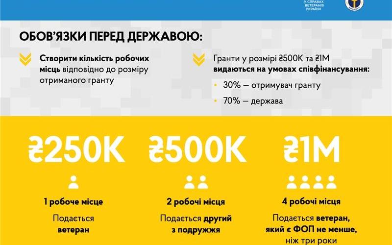 1 млн грн - для учасника бойових дій та/або особи з інвалідністю внаслідок війни, які зареєстровані як ФОП не менше ніж 3 роки, за умови створення чотирьох робочих місць, мінімум 2 з яких займуть ветерани або особи з інвалідністю внаслідок війни.