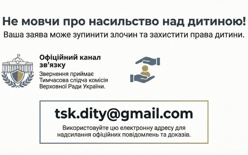 Про факти порушення прав дітей можна повідомити на електронну адресу Тимчасової слідчої комісії Верховної Ради України: tsk.dity@gmail.com.