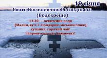 18.01.2022 10:46116219 січня відбудеться освячення води на території міського пляжу. Запрошуємо бажаючих!19 січня об 11.30 на території міського пляжу (Малин, вул. Г. Бондарик) відбудеться освячення води настоятелем Свято-Покровського храму, митрофорним протиієреєм, отцем Василем. Бажаючі зможуть... -