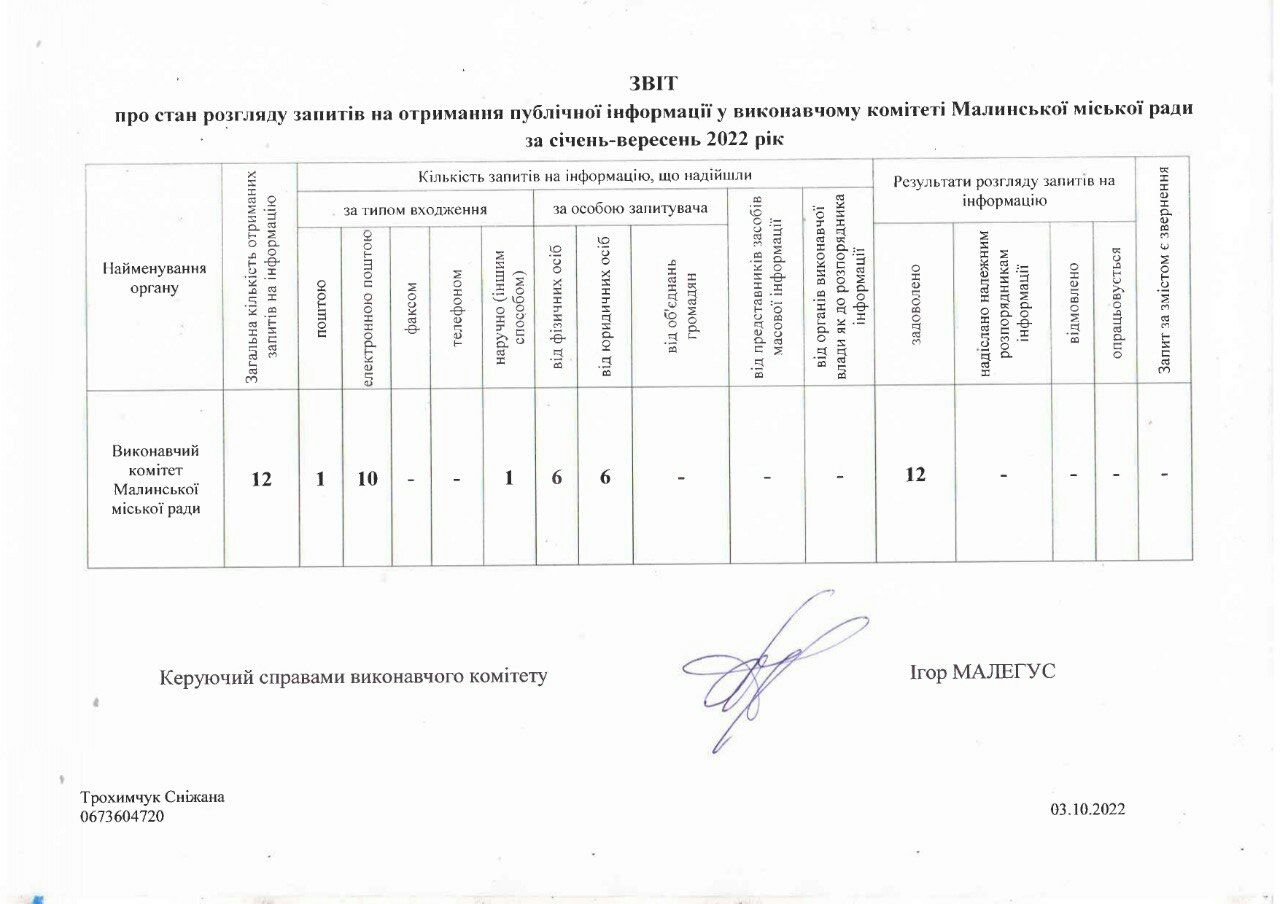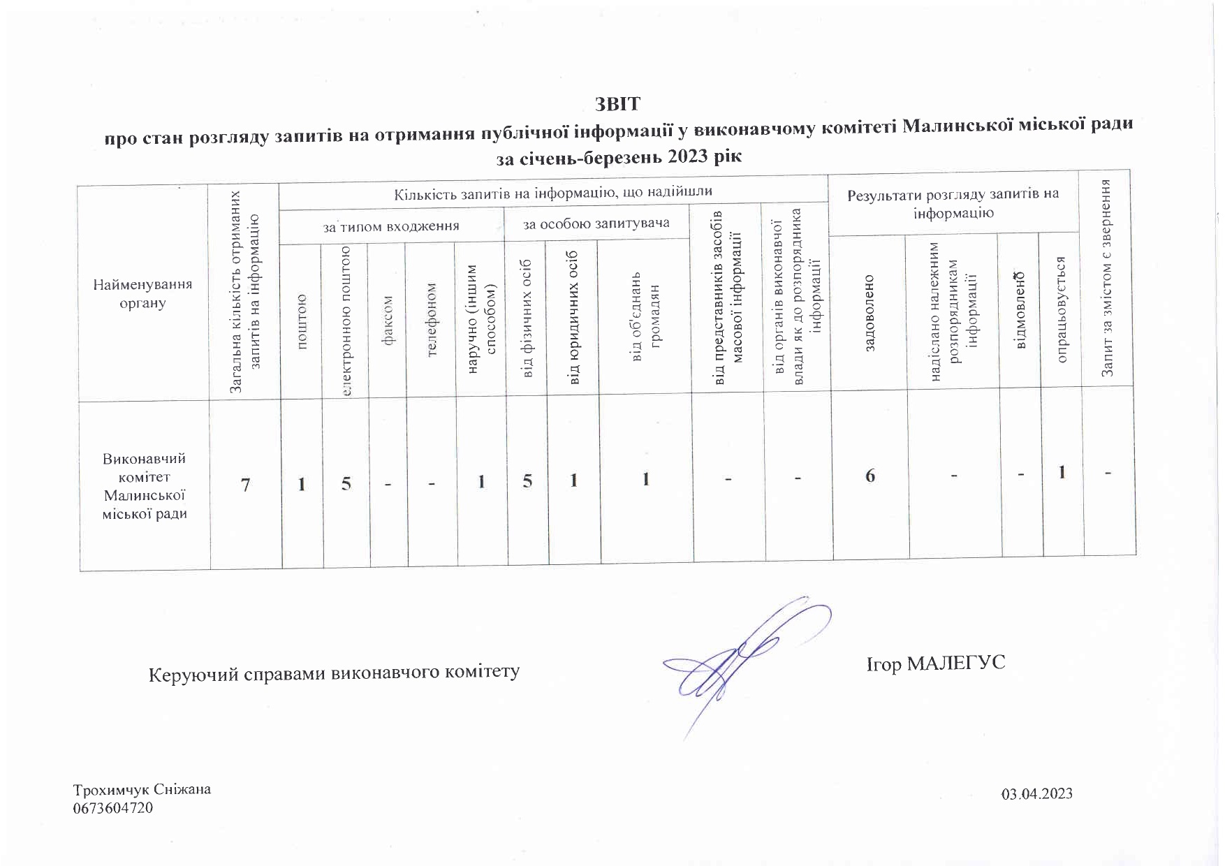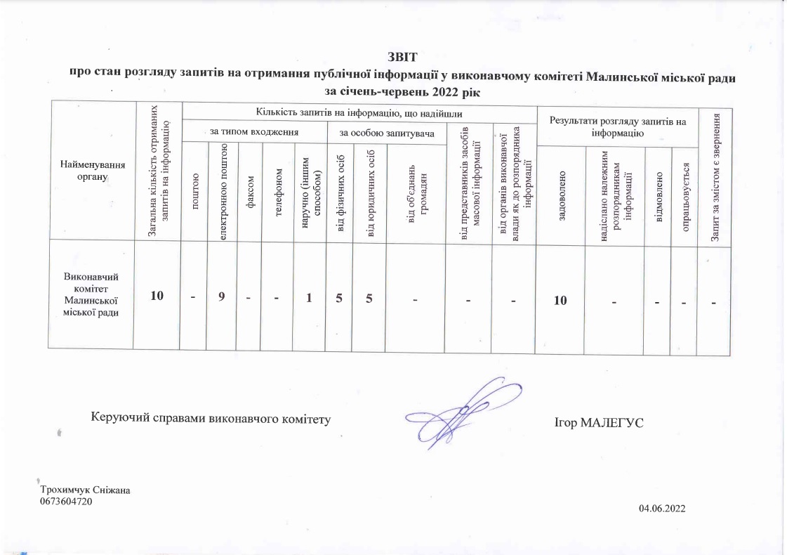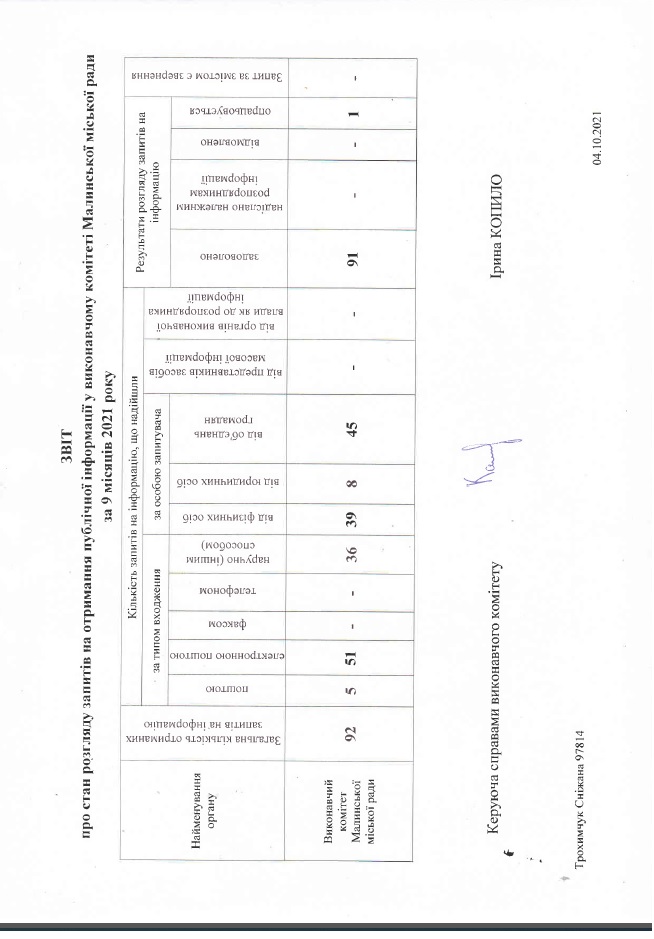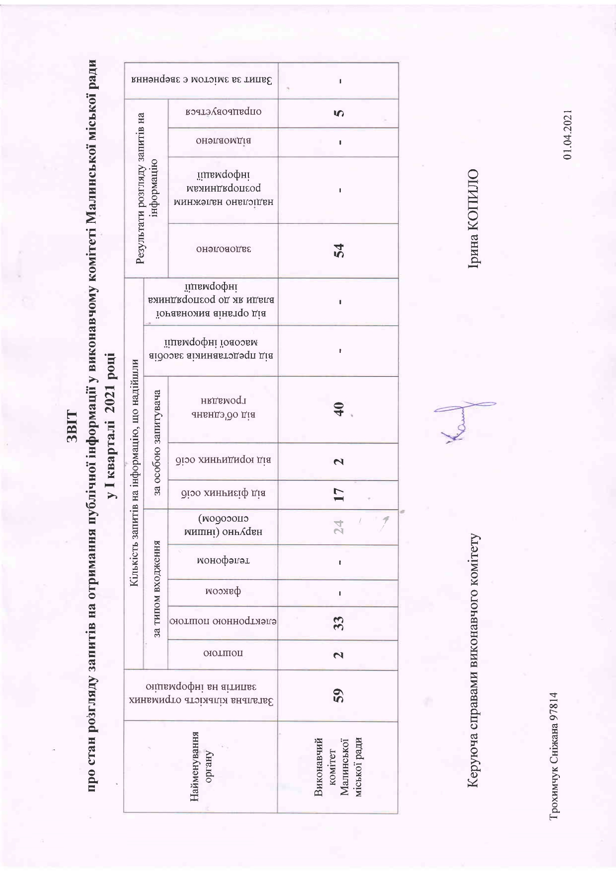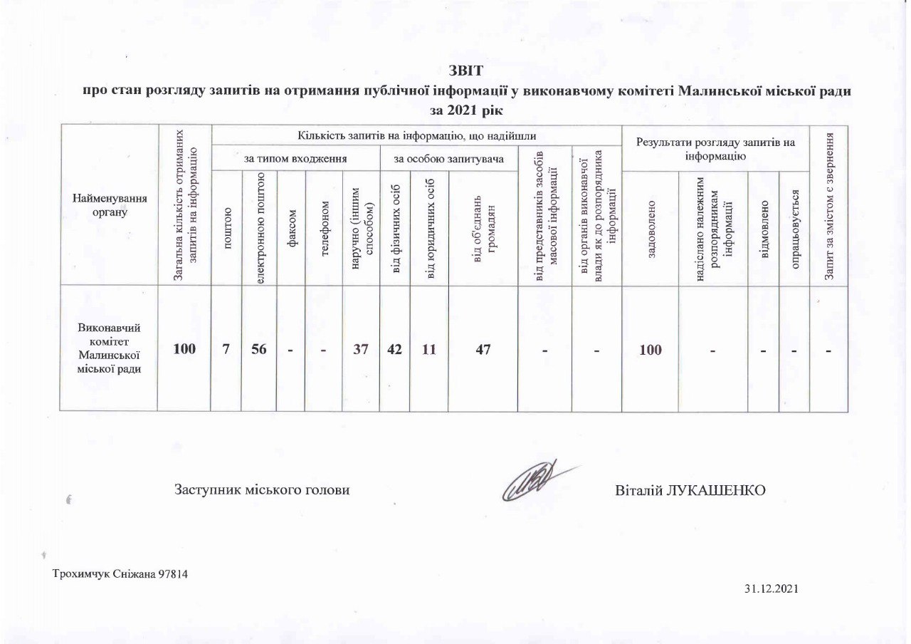 ЗВІТ про стан розгляду запитів на отримання публічної інформації у виконавчому комітеті Малинської міської ради у 2021 році