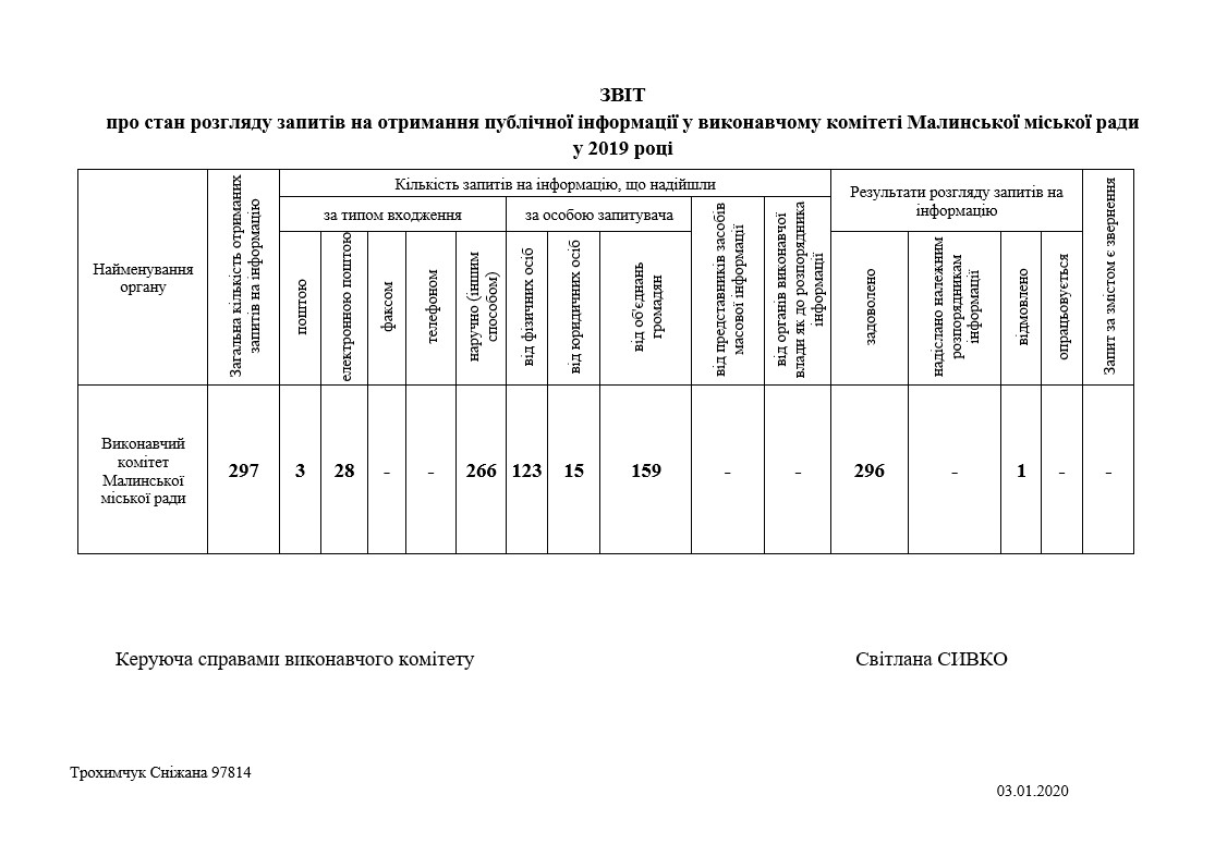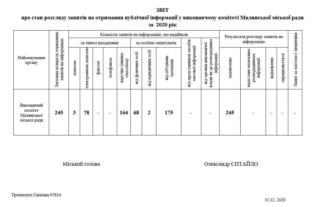 ЗВІТ про стан розгляду запитів на отримання публічної інформації у виконавчому комітеті Малинської міської ради у 2020 році