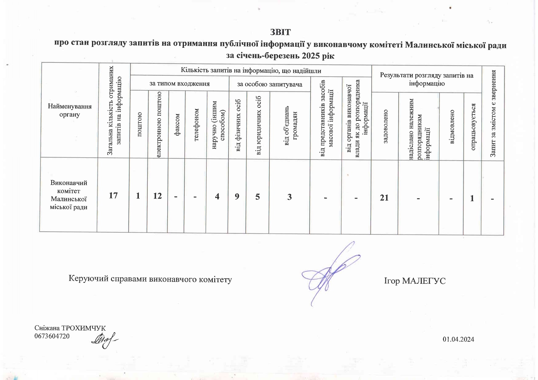 - Звіт про стан розгляду запитів на отримання публічної інформації у виконавчому комітеті за І квартал 2024 року
