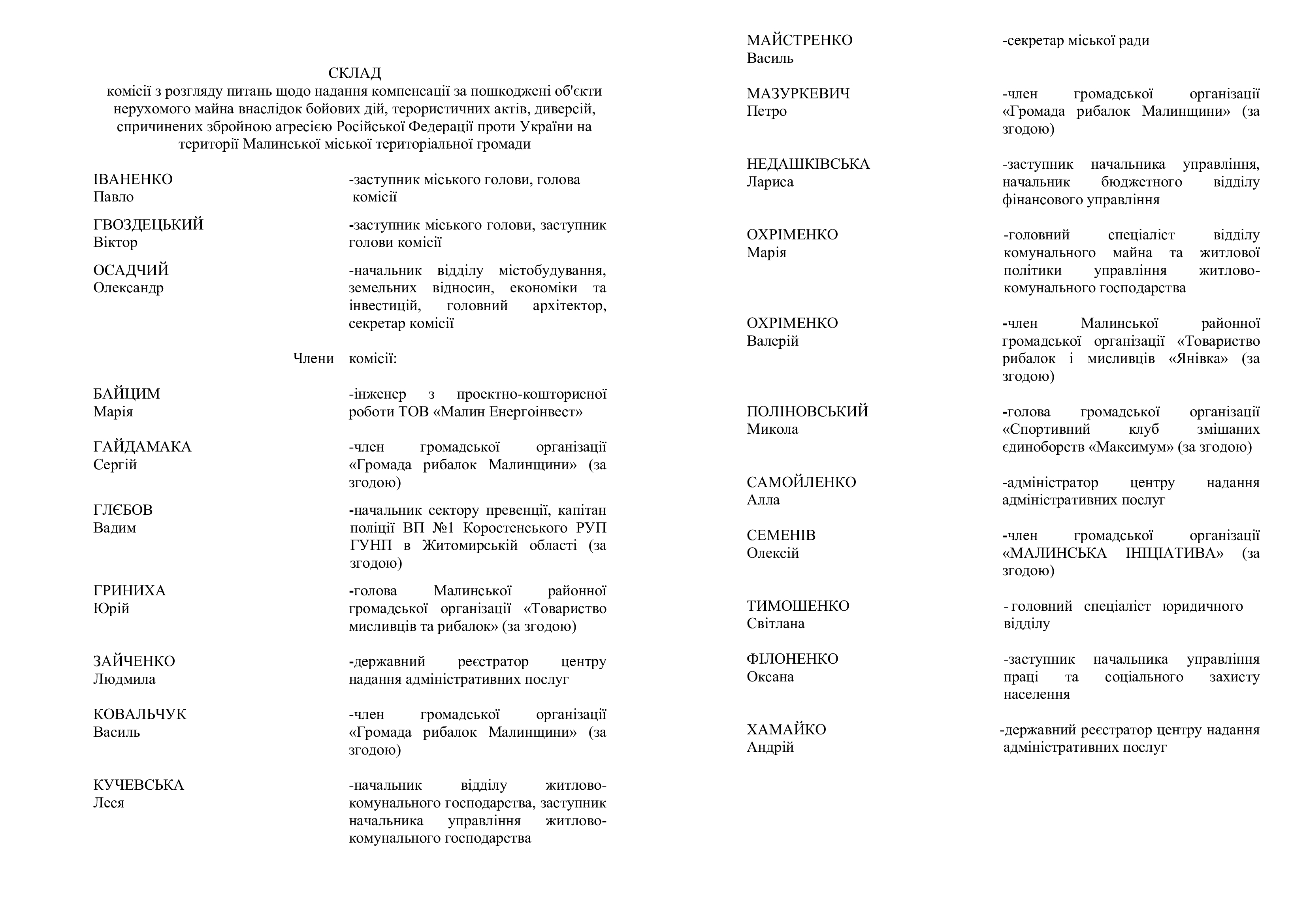Рішення виконкому від 16.06.2023 №177 Про затвердження нового складу комісії з розгляду питань щодо надання компенсації за пошкоджені об'єкти нерухомого майна внаслідок бойових дій, терористичних актів, диверсій, спричинених збройною агресією Російської Федерації проти України на території Малинської міської територіальної громади та Положення про неї в новій редакції"